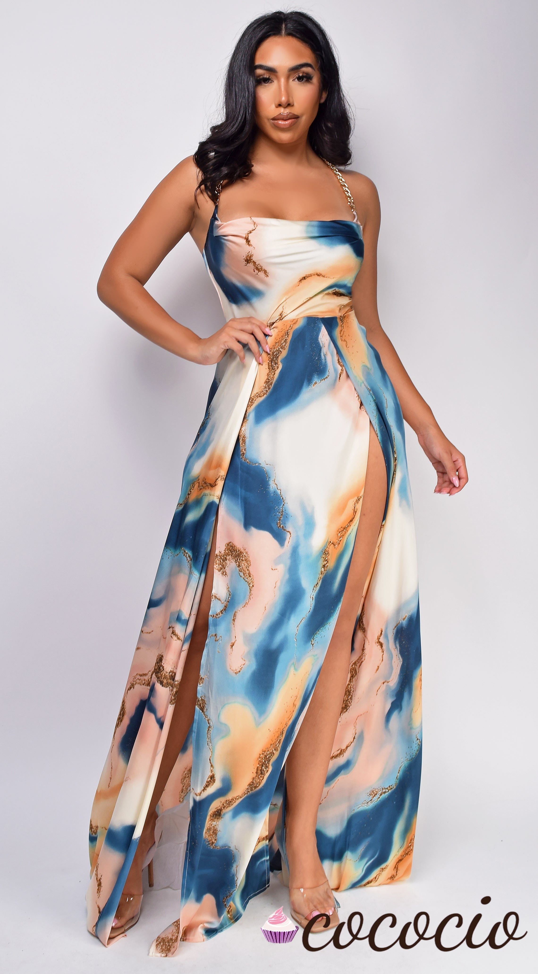 Stacci Beige Blue Multi Marble Double Slit Maxi Dress